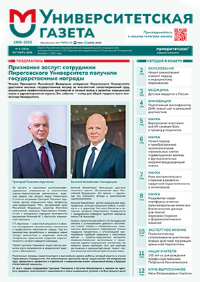 Ректор Университета С.А. Лукьянов стал лауреатом Научной премии «Сбера» | Карен Альбертович Егиазарян награжден орденом Мужества | Пять лет Регистру доноров костного мозга Пироговского Университета! | Концепция «Провизор 2.0». О создании профильных институтов в Пироговском Университете на примере Института фармации и медицинской химии (ИФМХ) | Золотые имена Пироговского Университета. Алексей Иванович Абрикосов и Григорий Абрамович Баткис | Передовые технологии стоматологического образования. Рассказ о лаборатории симуляционных технологий в стоматологии | Образовательное путешествие в Пироговский Университет. На базе РНИМУ им. Н.И. Пирогова реализуются экскурсионные программы для школьников | Описан первый в России клинический случай многолокусного нарушения импринтинга. Об исследовании рассказала Елизавета Григорьевна Панченко, один из авторов статьи, ассистент кафедры общей и медицинской генетики МБФ Пироговского Университета | Современные открытия в области иммуноонкологии. О современном состоянии в области иммунотерапии онкологических заболеваний и ожиданиях онкологов рассказывает Елена Владимировна Артамонова, д.м.н., профессор кафедры онкологии и лучевой терапии Института хирургии РНИМУ им. Н.И. Пирогова | Уникальная генная терапия для детей с редкой нейрометаболической патологией | Нейрохирурги Института Вельтищева освоили метод глубокой стимуляции структур головного мозга у детей с неконтролируемыми движениями | Клуб выпускников. Иван Геннадьевич Гордеев — д.м.н., профессор, заведующий кафедрой госпитальной терапии имени академика П.Е. Лукомского ИКМ РНИМУ им. Н.И. Пирогова, заместитель директора Института клинической медицины | Зимняя спартакиада Совета студенческих землячеств